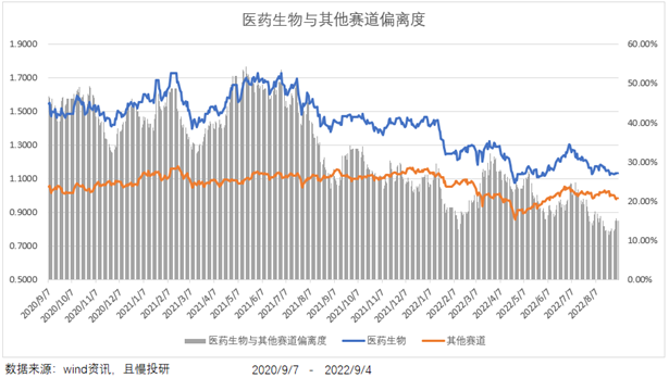 医药赛道与其他赛道偏离度在历史28%分位,整体趋势为向下回归。
