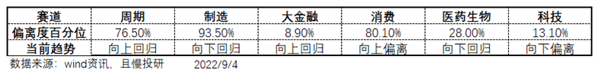 医药赛道2021年6月之后,处于持续的向下回归态势。从2021年年中与其他赛道偏离度95%左右分位,一直回归到当前28%分位。
