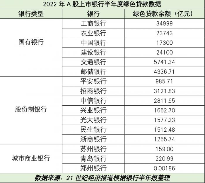 据21世纪经济报道记者统计,截至2022年8月31日,各大银行最新绿色贷款余额数据如下: