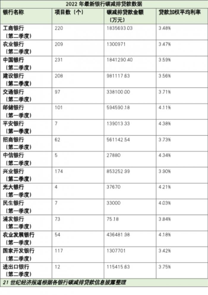 根据21世纪经济报道不完全统计,截至2022年8月31日,各大银行最新碳减排贷款数据如下: