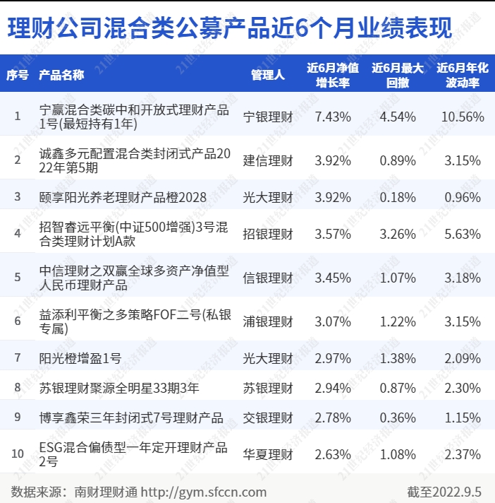 截至9月5日,在理财公司混合类公募产品近6月业绩榜单中,有9家理财公司的产品进入行业前10,分别是宁银理财、建信理财、光大理财、招银理财、信银理财、浦银理财、苏银理财、交银理财和华夏理财。其中,光大理财有2只产品上榜,其余理财公司各上榜1只产品。