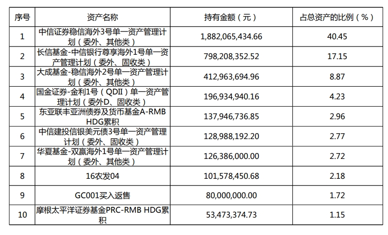 在投资组合上,“双赢全球多资产”重仓多项资管计划。在前十大资产中,委外类资管计划投资占比达76.19%。
