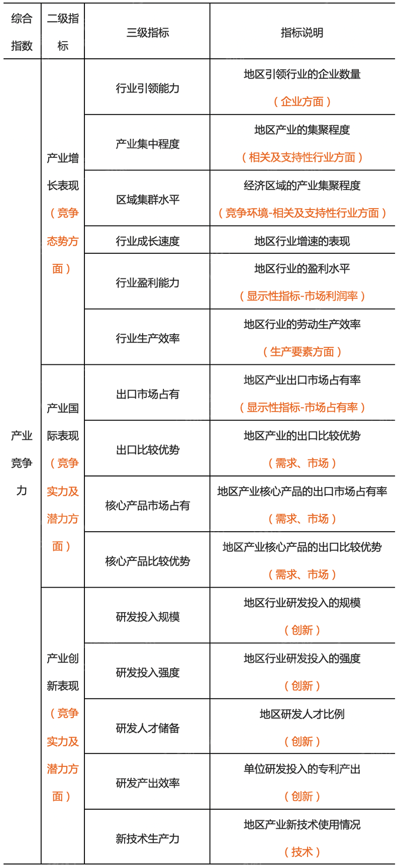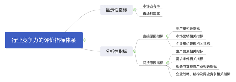 分析性指标:主要包括直接原因指标和间接原因指标。其中直接原因指标更多地包括已经是的竞争力得到显现的影响因素,而间接原因指标体现的是一个行业竞争力发展的潜力所在。
