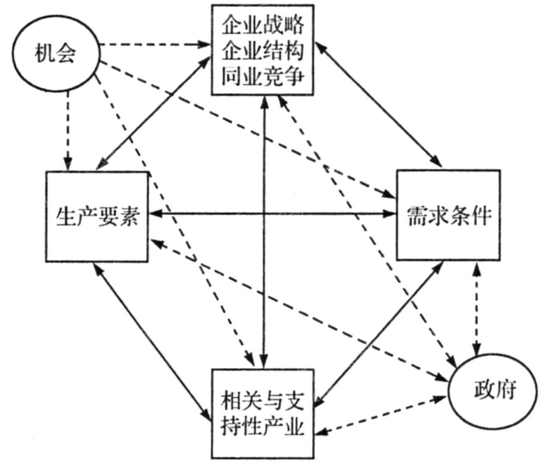 波特对多个国家、多个产业的竞争力进行深入研究后认为,产业竞争力是由生产要素,国内市场需求,相关与支持性产业,企业战略、企业结构和同业竞争等四个主要因素,以及政府行为、机遇等两个辅助因素共同作用而形成的。