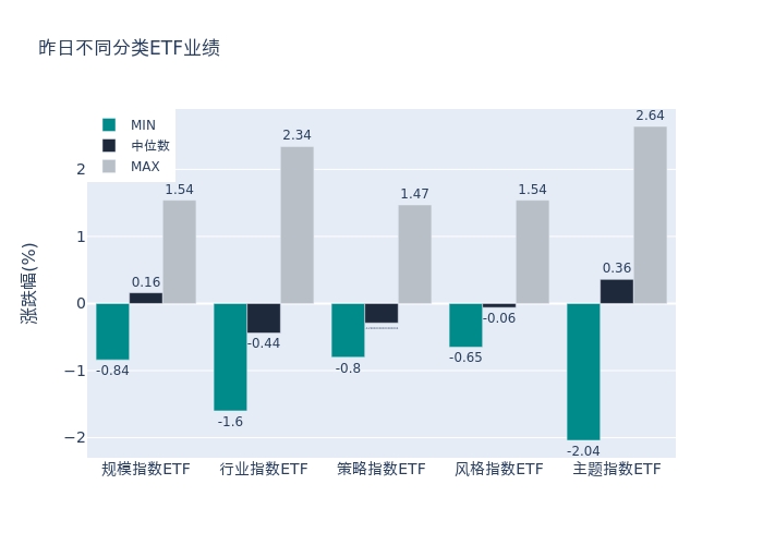 昨日股票型ETF收益率中位数为0.145%。其中按照不同分类,规模指数中汇添富中证沪港深张江自主创新50ETF收益率最高,为1.54%;行业指数中嘉实上证科创板新一代信息技术ETF收益率最高,为2.34%;策略指数中华安创业板50ETF收益率最高,为1.47%;风格指数中华夏创成长ETF收益率最高,为1.54%;主题指数中国联安半导体ETF收益率最高,为2.64%。