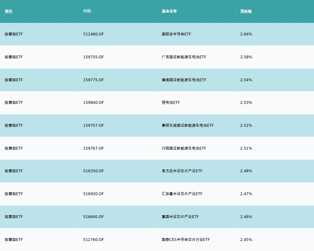 昨日股票型ETF涨幅最高的3支ETF及其收益率分别为:国联安半导体ETF(2.64%)、广发国证新能源车电池ETF(2.58%)、建信国证新能源车电池ETF(2.54%)。涨幅前10详情见下表: