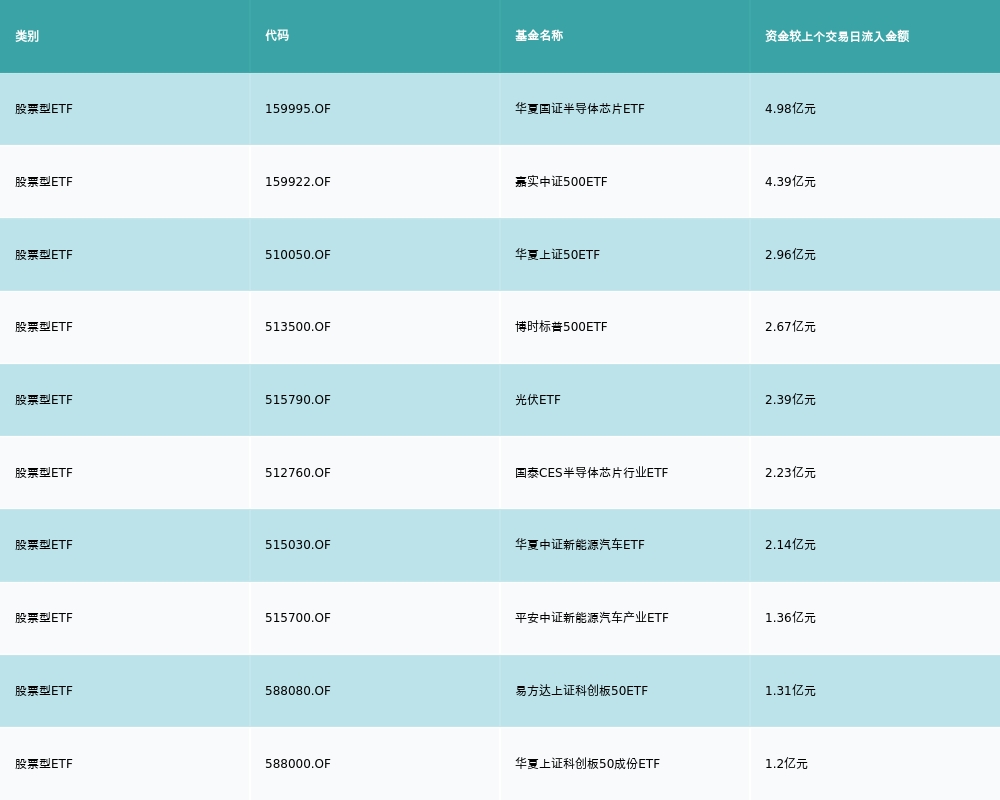 昨日股票型ETF资金流入最多的3支ETF及其流入金额分别为:华夏国证半导体芯片ETF(流入4.98亿元)、嘉实中证500ETF(流入4.39亿元)、华夏上证50ETF(流入2.96亿元)。资金流入前10详情见下表: