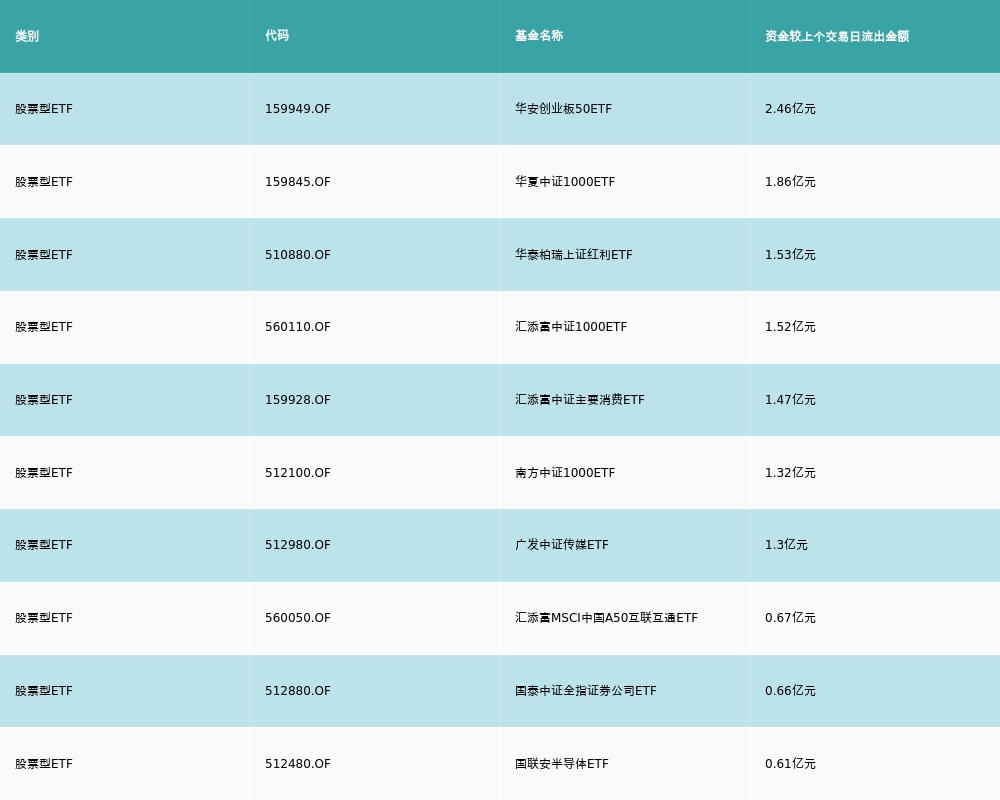 昨日股票型ETF资金流出最多的3支ETF及其流入金额分别为:华安创业板50ETF(流出2.46亿元)、华夏中证1000ETF(流出1.86亿元)、华泰柏瑞上证红利ETF(流出1.53亿元)。资金流出前10详情见下表: