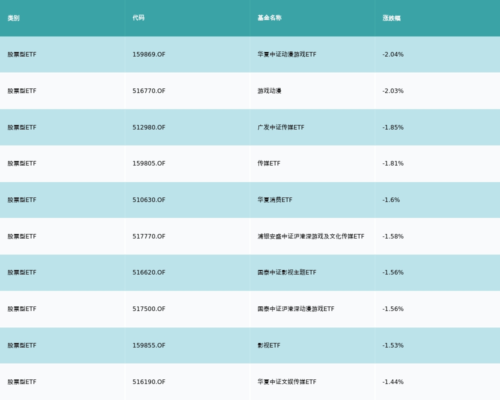 昨日股票型ETF跌幅最大的3支ETF及其收益率分别为:华夏中证动漫游戏ETF(-2.04%)、游戏动漫(-2.03%)、广发中证传媒ETF(-1.85%)。跌幅前10详情见下表: