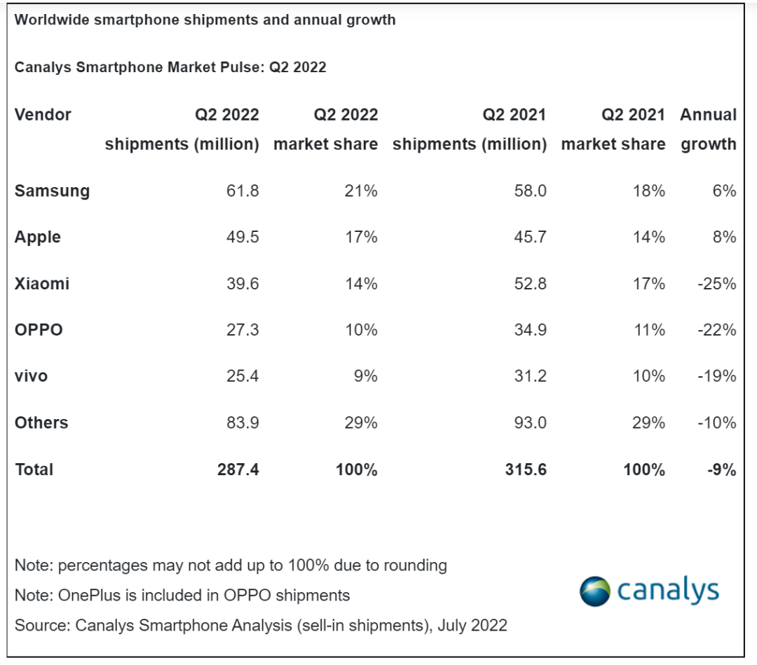科技市场独立分析机构Canalys发布的报告显示,2022年Q2,全球智能手机的出货量,同比下降9%。排名前五的,是三星、苹果、小米、OPPO、vivo,荣耀的份额仍然在“others”里面。