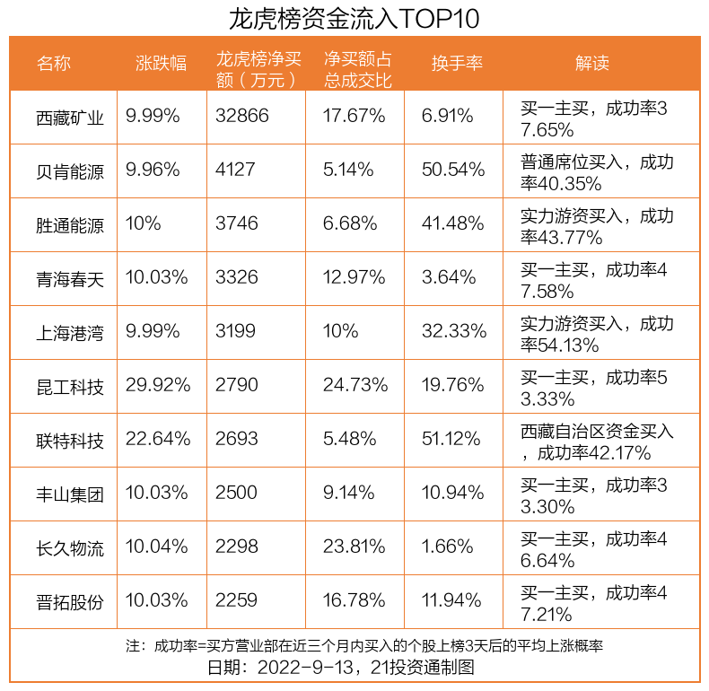 9月13日,上证指数上涨0.05%,深证成指上涨0.38%,创业板指上涨0.09%。盘后龙虎榜数据显示,共有35只个股因当日异动登上龙虎榜,资金净流入最多的是西藏矿业(000762.SZ),达3.29亿元。