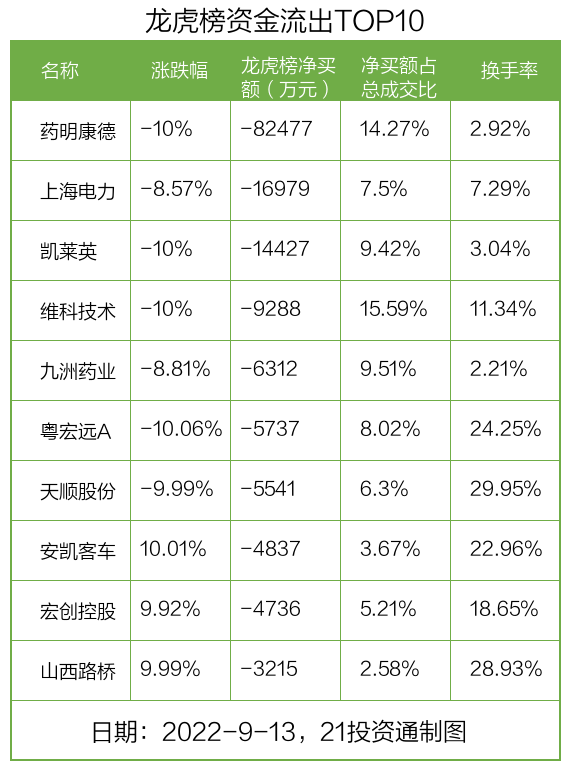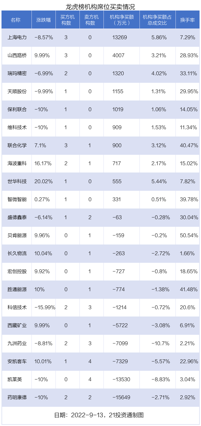 9月13日,21只个股龙虎榜出现了机构的身影,机构合计净卖出2.83亿元。具体来看,机构净买入10股,净卖出11股。