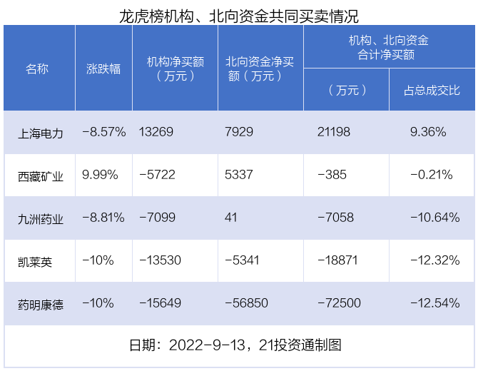 值得注意的是,机构和北向资金共同净买入了上海电力;共同净卖出了凯莱英、药明康德等2股;在西藏矿业,九洲药业上出现分歧,机构净卖出西藏矿业5721.62万元,北向资金净买入5336.54万元;机构净卖出九洲药业7098.91万元,北向资金净买入40.92万元。