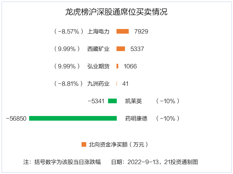 9月13日,北向资金参与龙虎榜中的个股共有6只,合计净卖出4.78亿元。其中沪股通净买入2 股,净卖出1 股,合计净卖出4.89亿元;深股通净买入2 股,净卖出1 股,合计净买入1061.71万元。