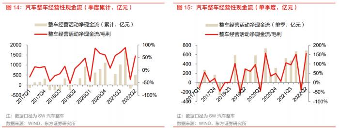 行业整体现金流季度环比改善。上半年整车行业(数据口径为SW汽车整车)经营活动现金流累计净额509.40亿元,同比下降8.6%,主要受1季度整车行业现金流净额-176.97亿元拖累;2季度整车行业经营活动现金流净额686.37亿元,同比、环比增长31.5%、487.8%,经营活动现金流情况同环比大幅改善,预计主要系长城汽车、比亚迪、上汽等现金流管控能力优化。