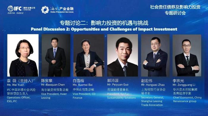9月8日,在由世界银行集团国际金融公司(IFC)、海尔融资租赁主办,社会价值投资联盟协办的“社会责任债券及影响力投资”专题研讨会上,商道融绿董事长郭沛源、海尔融资租赁副总裁陈宝泉、中和农信副总裁白雪梅、上海租赁行业协会秘书长赵宏伟、华兴资本控股集团首席经济学家李宗光围绕“影响力投资的机遇与挑战 ”为主题进行了分享。