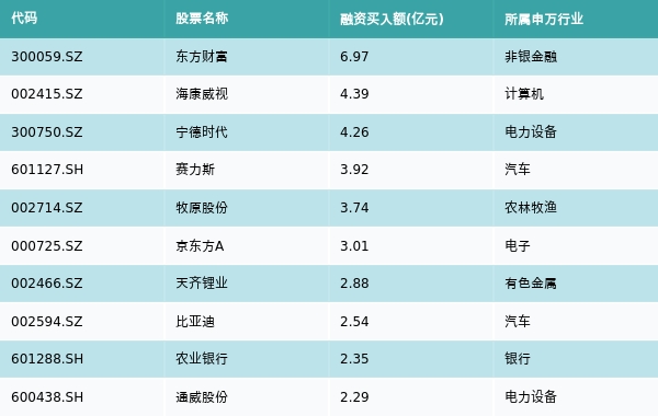 9月19日,两市共有2432只个股有融资资金买入,其中东方财富、海康威视、宁德时代排名前三,买入金额分别6.97亿元、4.39亿元、4.26亿元。融资买入额前10个股详情见下表: