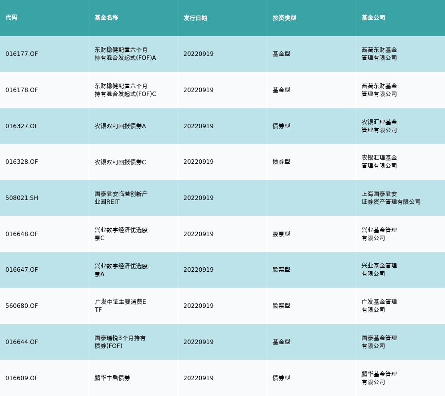 9月19日,有10只新基金发行,分别为:东财稳健配置六个月持有混合发起式(FOF)A、东财稳健配置六个月持有混合发起式(FOF)C、农银双利回报债券A、农银双利回报债券C、国泰君安临港创新产业园REIT、兴业数字经济优选股票C、兴业数字经济优选股票A、广发中证主要消费ETF、国泰瑞悦3个月持有债券(FOF)、鹏华丰启债券,详情见下表: