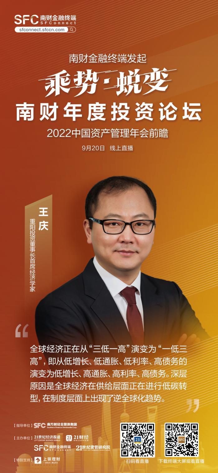 南方财经全媒体记者 杨希 北京报道 9月20日,2022中国资产管理年会前瞻-南财年度投资论坛于线上举办。重阳投资董事长、首席经济学家王庆出席并以“全球经济变局下的资产配置新常态”为题发表演讲。王庆认为,全球经济正在从“三低一高”演变为“一低三高”,即从低增长、低通胀、低利率、高债务的演变为低增长、高通胀、高利率、高债务。其深层原因是全球经济在供给层面正在进行低碳转型,在制度层面上出现了逆全球化趋势。