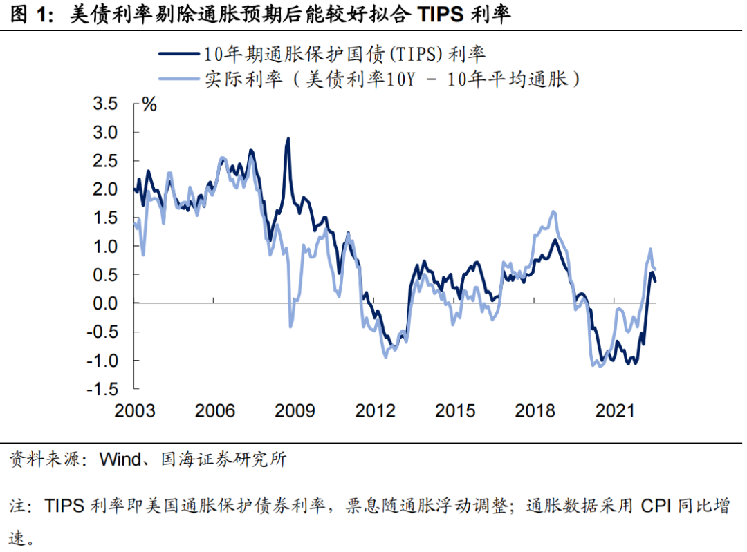 将名义利率拆分为通胀预期和实际利率的方法,在美国通胀保护国债(TIPS)市场上可以得到有效印证。由于通胀保护国债票息随通胀浮动,因此TIPS利率往往被用来作为实际利率的“替代品”。如果将10年期美债利率减去过往10年的平均CPI同比增速,其结果和TIPS利率高度拟合。