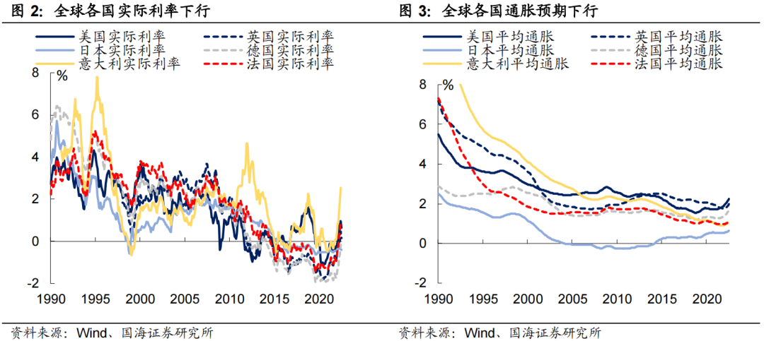 我们在上期报告《利率还有下行空间吗?》中提到,从“大通胀”时期落幕以来,全球各国利率呈现不断下行的趋势。我们采用相同的拆分方法,对全球各国的10 年期国债利率走势进行分析。不难发现,近40年来全球利率的下行由通胀预期和实际利率中枢的下行共同推动。