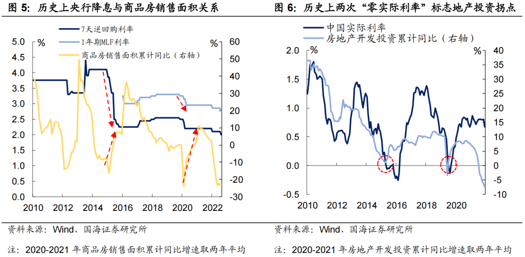 历史上来看,中国实际利率和地产投资几乎同时见底。在2016年和2020年,国内经济存在较大下行压力时,随着央行逐渐降息,地产销售逐渐企稳,率先见底。随着销售回款的反弹,地产开发商资产负债表持续改善,地产投资逐渐见底。