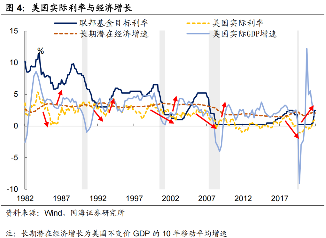 以美联储为例,当美国经济进入下行周期后,美联储通过下调联邦基金利率,引导实际利率下行,可以帮助经济增长向长期平均增长趋势回归。