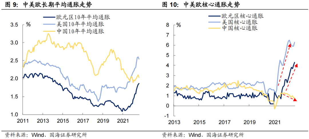 1)疫情以来,中国以“保供给”为目标,国内通胀水平较低。2020年疫情爆发后,相较于欧美采取货币、财政双宽松,刺激需求的政策导向。中国货币政策不搞“大水漫灌”,将重心放在“保供给”上。在此格局下,相较于欧美“供给不足”,中国面临的实际上是“需求不足”。