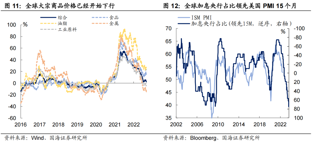 目前全球进入加息周期的央行数量占比高达75%,因此,未来一年,海外需求将继续退坡,进而带动2023年大宗商品价格增速继续下行,从而使得全球通胀也出现阶段性共振下行。