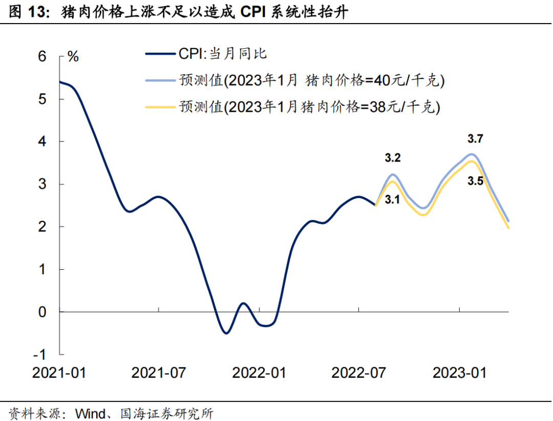经测算,我们认为,本轮随着猪肉价格的上涨,CPI增速的高点或许会出现在2023年1季度,高点或许在3.6%水平上下。后续受供给和基数效应影响,猪肉价格较难继续带动国内CPI维持高位运行。