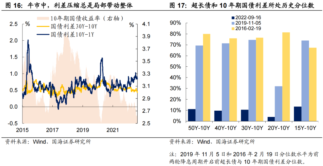 2)超长债需“谨慎看多”。从历史上来看,在债券牛市行情中,总是呈现“脉冲式”期限利差压缩行情,往往是先压缩10年与1年期限利差,再压缩超长端与10年期利差,如此往复。
