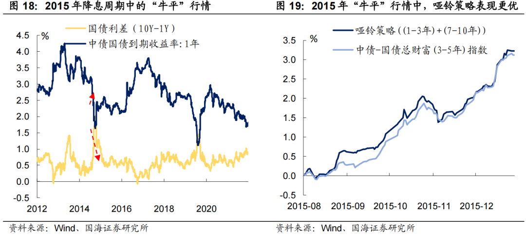 其次,从组合配置上,我们认为可以适合配置哑铃策略。目前10年减1年利差仍处于历史高位,期限结构向牛平演绎的胜率更高。在牛平演绎过程中,通过配置哑铃策略,增加组合凸性,将相较一般密集配置相近久期券种的“子弹策略”更具性价比。