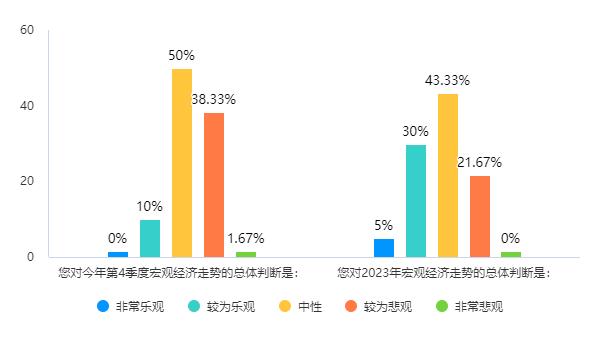 据此次问卷调查结果,一半左右的受访人士对今年第4季度宏观经济走势的总体判断为中性,对今年4季度宏观经济走势较为悲观的受访者占比达到38.33%,仅10%的受访人士对今年4季度宏观经济走势较为乐观,接受问卷调查的专家相对更乐观些,17.65%的专家对今年4季度宏观经济走势较为乐观。