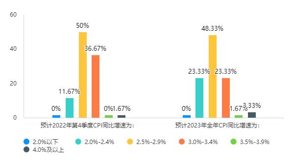 对于明年的CPI增速预测,认为将在2.5%-2.9%区间的同样最多,比例为48.33%,认为在2.0%-2.4%区间和3.0%-3.4%区间的受访者比例相同,均为23.33%。预测CPI破3的受访者比例明显减少。可见大部分受访者不认为明年的CPI上行压力更大。在被问及影响2022年第4季度CPI最大因素时,41.67%的受访者认为是猪肉,33.33%的受访者认为是大宗商品。受访的专家当中认为“猪肉是影响2022年第4季度CPI最大因素”的比例更高,达64.71%。