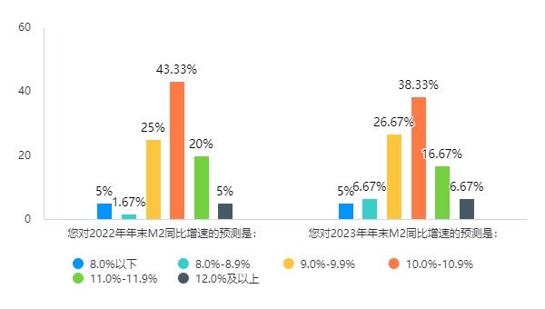 对于今年年末的M2增速预测,43.33%的受访者认为在10.0%-10.9%的区间,25%的受访者认为在9.0%-9.9%,20%的受访者认为在11%-11.9%;至于明年年末的M2增速预测,76.67%的受访者认为明年M2增速在10.9%以下,仅23.34%的受访者认为明年M2增速在11%以上。