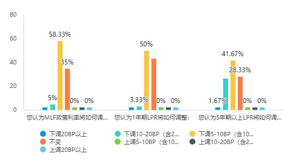 大部分受访者认为今年4季度央行可能降息,58.33%的受访者预计MLF政策利率将下调5-10BP(含10BP),35%的受访者认为将不变。50%的受访者认为1年期LPR利率将下调5-10BP(含10BP)。认为5年期以上LPR利率将下调的受访者也不少,41.67%的受访者认为5年期以上LPR利率将下调5-10BP(含10BP),26.67%的受访者认为5年期以上LPR利率将下调10-20BP(含20BP)。受访的专家76.47%的比例认为5年期以上LPR利率将下调5-10BP(含10BP)。可见大部分专家认为再次降息稳地产的可能性较大。