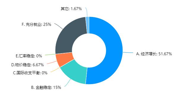 51.67%受访者认为2022年第4季度我国央行货币政策的最优先目标是经济增长,25%的受访者认为是“充分就业”。仅6.67%的受访者选“物价稳定”,可见大部分受访者不认为物价因素会干扰2022年4季度货币政策。