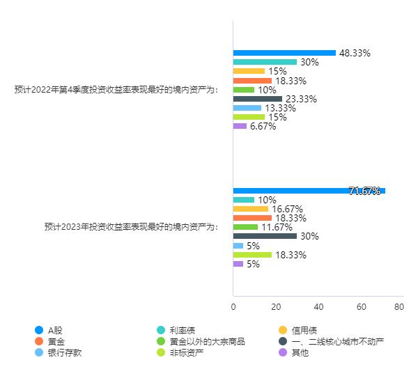 在预测2022年第4季度投资收益率表现最好的境内资产时,48.33%的受访者选择了A股,30%的受访者选择了利率债,23.33%的受访者选择了一、二线核心城市不动产。接受问卷调查的专家中选择A股的比例更高,达64.71%,选择利率债和黄金的专家比例均为23.53%。