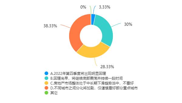 大部分受访者对房地产依然不看好,38.33%的受访者认为“不同城市之间分化将加剧,仅谨慎看好部分重点城市”,30%的受访者认为“楼市回暖尚早,将继续底部震荡并持续一段时间”,28.33%的受访者认为“房地产市场整体处于中长期下滑趋势当中,不看好”。接受问卷调查的专家也不认为房地产可以在短期内扭转“颓势”,52.94%的专家认为“房地产回暖尚早,将继续底部震荡并持续一段时间”。