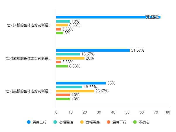 受访者对明年A股表现更乐观,73.33%的受访者认为明年A股将震荡上行;51.67%的受访者认为明年港股将震荡上行,认为将宽幅震荡或者窄幅震荡的受访者也不在少数。对美股走势则分歧较大,35%认为将震荡上行,26.67%认为将宽幅震荡。