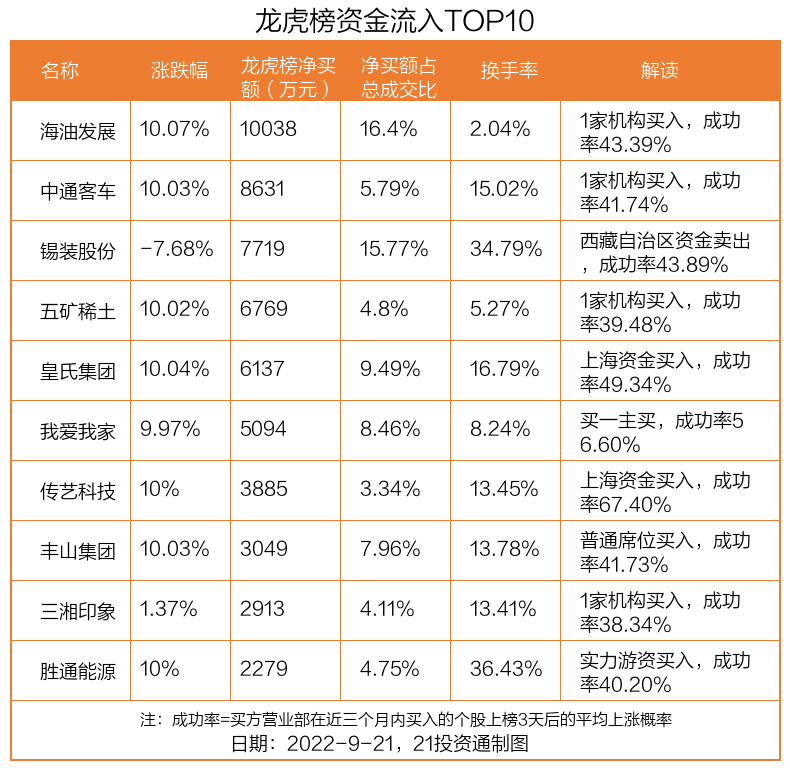 42只上榜的龙虎榜个股中,23只个股被净买入,19只个股被净卖出。其中,资金净买入最多的是海油发展,达1亿元,占总成交金额的16.4%。海油发展当日收盘上涨10.07%,换手率为2.04%。