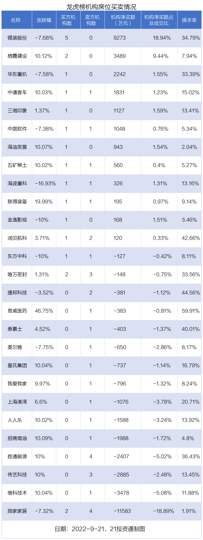 9月21日,27只个股龙虎榜出现了机构的身影,机构合计净卖出7309.47万元。具体来看,机构净买入12股,净卖出15股。