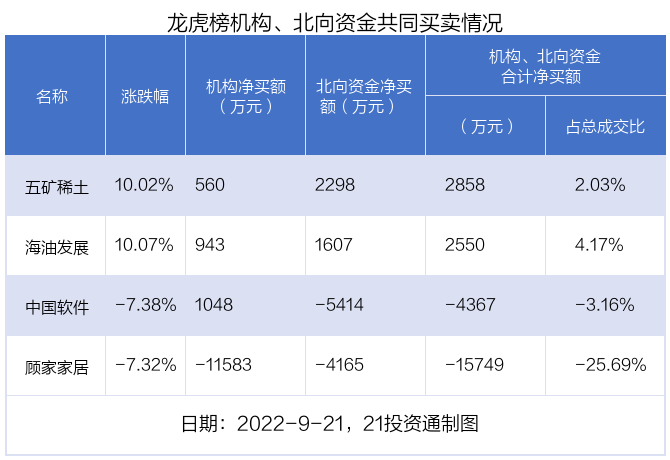 值得注意的是,机构和北向资金共同净买入了五矿稀土、海油发展;共同净卖出了顾家家居;在中国软件上出现分歧,机构净买入中国软件1047.53万元,北向资金净卖出5414.16万元。
