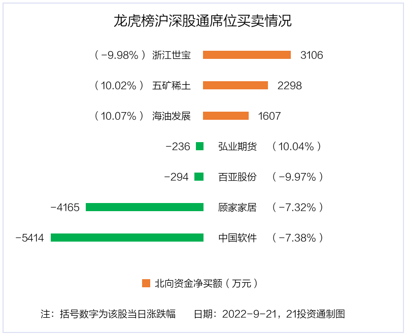 9月21日,北向资金参与龙虎榜中的个股共有7只,合计净卖出3099.05万元。其中沪股通净买入1 股,净卖出2 股,合计净卖出7972.1万元;深股通净买入2 股,净卖出2 股,合计净买入4873.05万元。