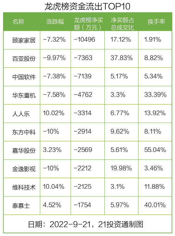 而龙虎榜中资金净流出最多的是顾家家居(603816.SH),被净卖出为1.05亿元,占总成交金额的17.12%。顾家家居收盘下跌7.32%,换手率为1.91%。