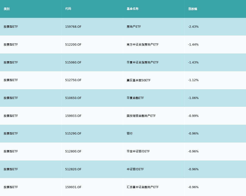 昨日股票型ETF跌幅最大的3支ETF及其收益率分别为:房地产ETF(-2.43%)、南方中证全指房地产ETF(-1.44%)、华夏中证全指房地产ETF(-1.43%)。跌幅前10详情见下表: