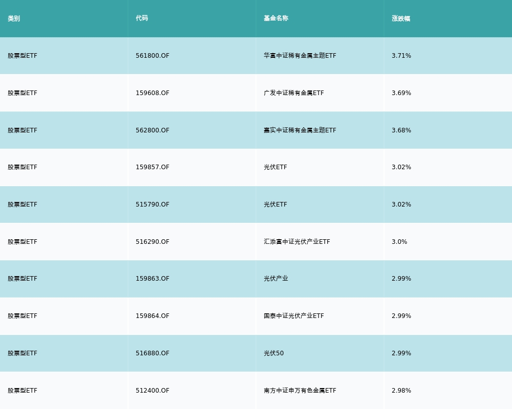 昨日股票型ETF涨幅最高的3支ETF及其收益率分别为:华富中证稀有金属主题ETF(3.71%)、广发中证稀有金属ETF(3.69%)、嘉实中证稀有金属主题ETF(3.68%)。涨幅前10详情见下表: