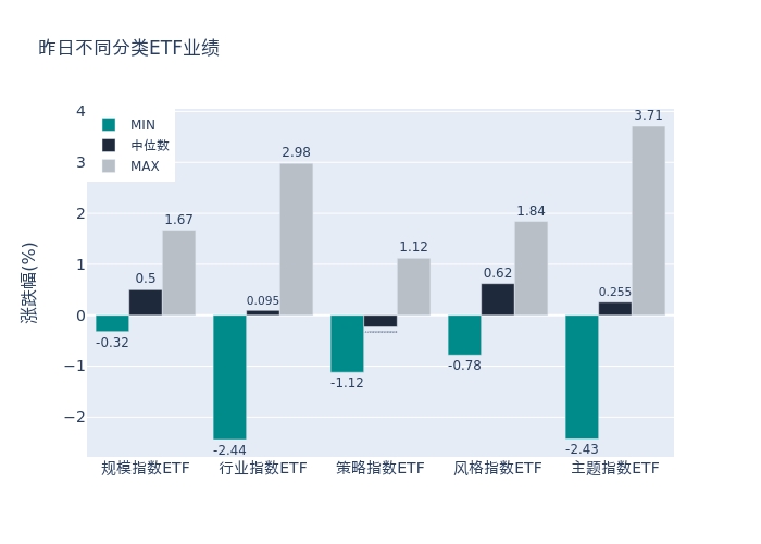 昨日股票型ETF收益率中位数为0.34%。其中按照不同分类,规模指数中万家国证2000ETF收益率最高,为1.67%;行业指数中南方中证申万有色金属ETF收益率最高,为2.98%;策略指数中华安创业板50ETF收益率最高,为1.12%;风格指数中博时成渝经济圈ETF收益率最高,为1.84%;主题指数中华富中证稀有金属主题ETF收益率最高,为3.71%。