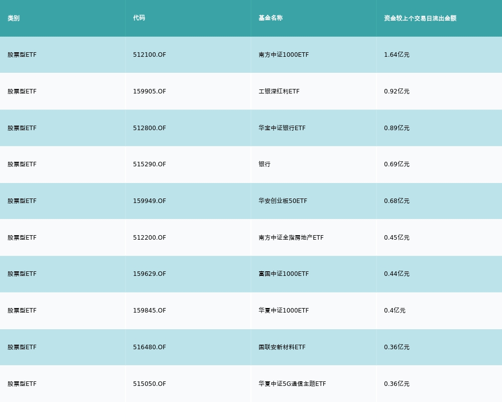 昨日股票型ETF资金流出最多的3支ETF及其流入金额分别为:南方中证1000ETF(流出1.64亿元)、工银深红利ETF(流出0.92亿元)、华宝中证银行ETF(流出0.89亿元)。资金流出前10详情见下表: