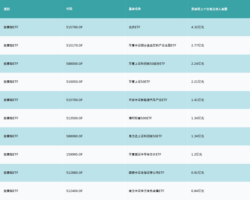 昨日股票型ETF资金流入最多的3支ETF及其流入金额分别为:光伏ETF(流入4.32亿元)、华夏中证细分食品饮料产业主题ETF(流入2.77亿元)、华夏上证科创板50成份ETF(流入2.24亿元)。资金流入前10详情见下表: